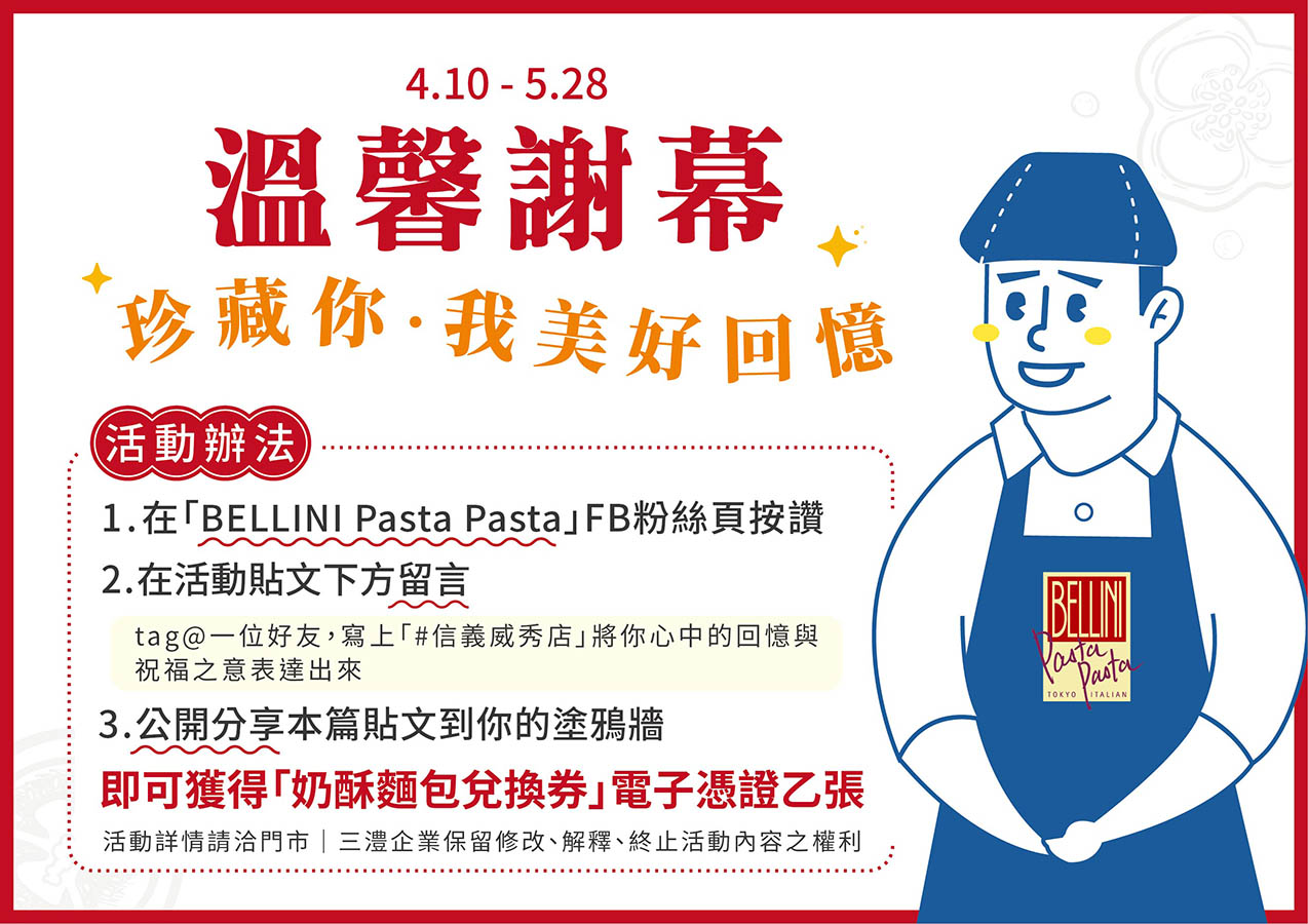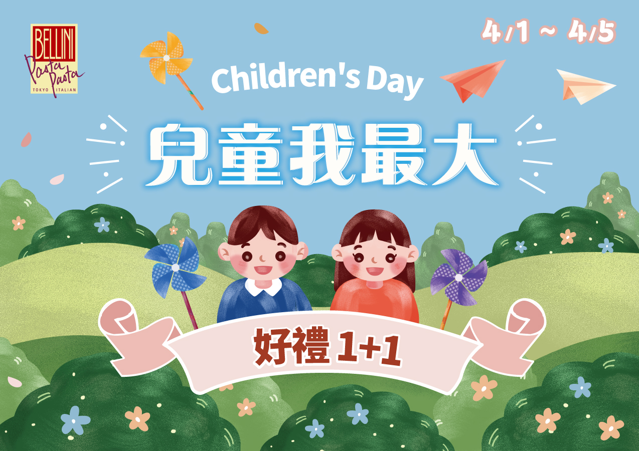 ∎ 凡至BELLINI Pasta Pasta憑成人點任一口味義大利麵,招待兒童「同口味小份義大利麵」乙份+送「三澧兒童套票」*不適用千層麵/手工新鮮義大利麵品項