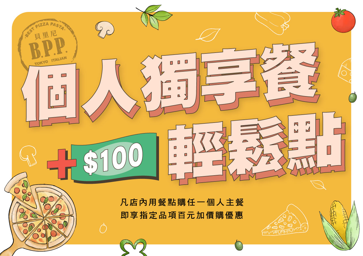 平日一~五14:30前(國定假日除外)凡點購任一個人主餐-比薩/義大利麵/燉飯/主菜即可享$100輕鬆加購指定品項!加購品項含:湯品/沙拉/開胃小菜/甜點/飲品