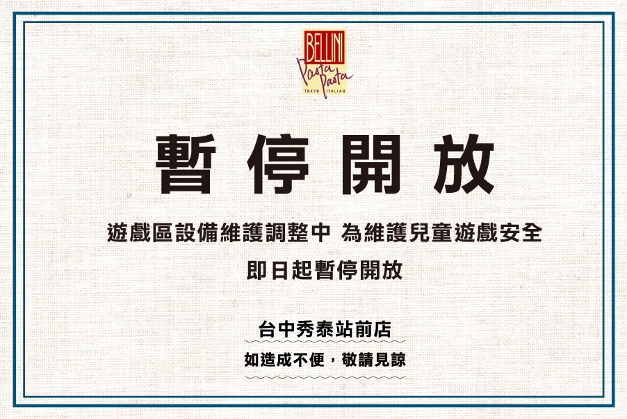 親愛的家長和小朋友們由於遊戲區正在進行設備維護,為了確保孩子們的安全,我們將暫停開放遊戲區。對此帶來的不便,我們深表歉意,感謝您的理解和支持。